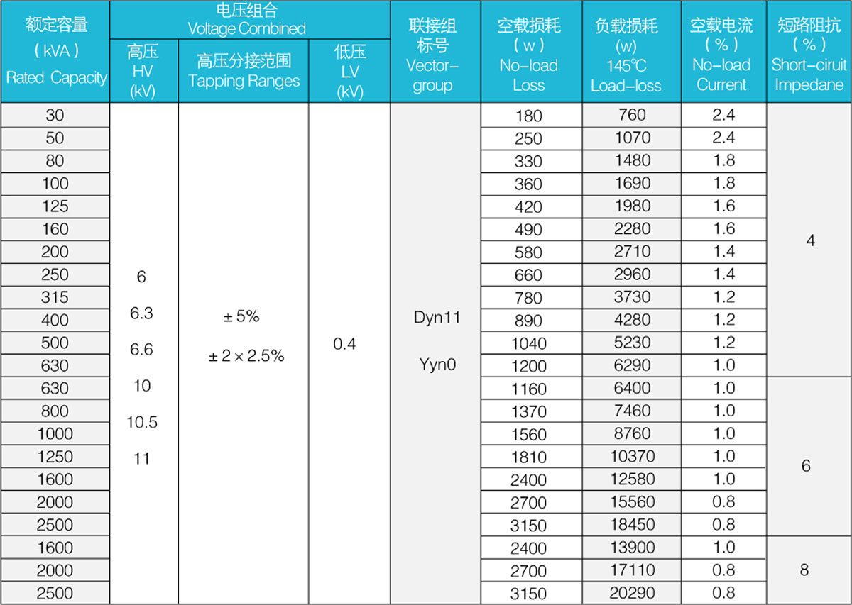 6. 損耗低,節能效果好,與SC9系列干式變樂基相比空載損耗平均下降10%,負載損耗下降5%。